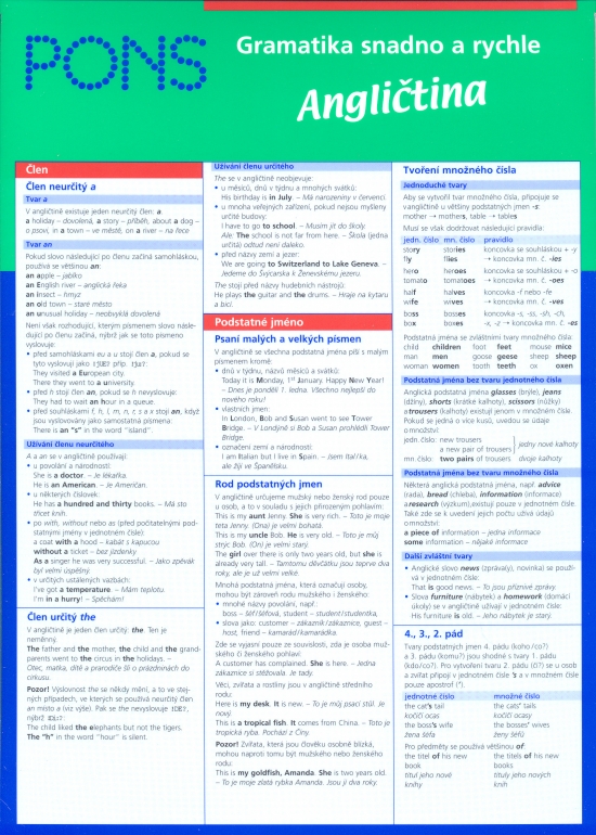 Praktický "tahák" pro žáky a studenty, do úřadů a institucí, v nichž se hovoří cizími jazyky, pro každého, kdo potřebuje rychle najít informace o základních gramatických jevech. Šestistránková laminovaná a omyvatelná skládačka s jednoduchým a přehledným grafickým řešením, barevně zvýrazněnými výjimkami a příkladovými větami s českými překlady. Tato pomůcka vám poskytne vše důležité o mluvnici i pravopisných zvláštnostech jazyka, který právě studujete. Založte si ji do svých oblíbených pořadačů! Spolu s podobnými materiály edice PONS může vytvořit základ vaší jazykové průpravy.