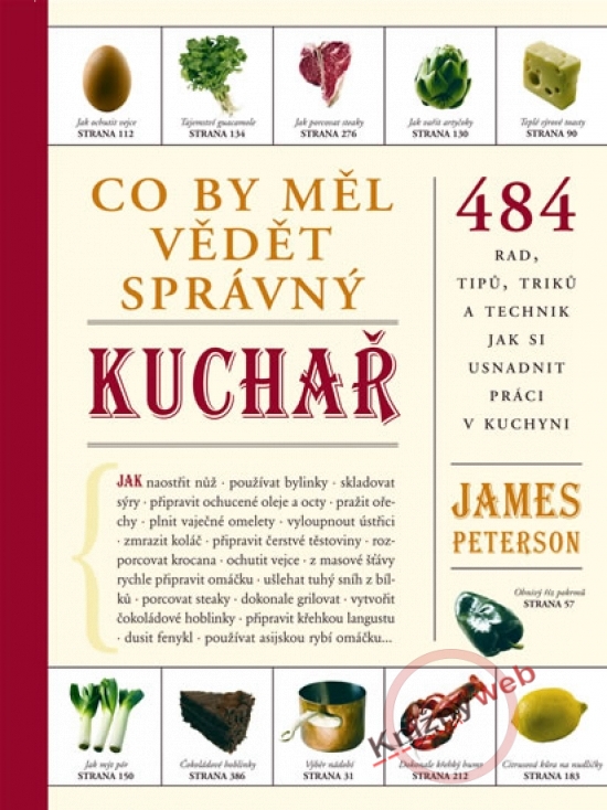 James Peterson Co by měl vědět správný kuchař 484 rad, tipů, triků a technik jak si usnadnit práci v kuchyni JAK naostřit nůž . používat bylinky . skladovat sýry . připravit ochucené oleje a octy . pražit ořechy . plnit vaječné omelety . vyloupnout ústřici . zmrazit koláč . připravit čerstvé těstoviny . rozporcovat krocana . ochutit vejce . upéct páj . z masové šťávy rychle připravit omáčku . ušlehat tuhý sníh z bílků . poznat čerstvé houby . porcovat steaky . dokonale grilovat . vytvořit čokoládové hoblinky . připravit křehkou langustu . vařit v páře . dusit fenykl . používat asijskou rybí omáčku .