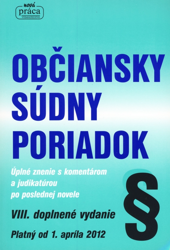 Základným prameňom civilného procesného práva ako relatívne samostatného právneho odvetvia slovenského právneho poriadku je Občiansky súdny poriadok (OSP), ktorý bol už veľakrát novelizovaný. Občianskoprávne veci podrobnejšie upravuje Občiansky súdny poriadok. Medzi občianskoprávne veci patria podľa tohto zákona veci, ktoré vyplývajú z občianskoprávnych, obchodnoprávnych, pracovnoprávnych, rodinných a družstevných vzťahov, ako aj vzťahov sociálneho zabezpečenia, pokiaľ ich podľa zákona neprejednávajú a nerozhodujú o nich iné orgány (§ 7 OSP). Do rúk sa Vám dostane úplné znenie zákona po poslednej novele vykonanej zákonom NR SR č. 388/2011 Z. z. s rozsiahlym komentárom a doplnenou judikatúrou zachytávajúci právny stav k 1. aprílu 2012.